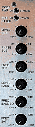 - Subwoofer: Butterworth 3.Ordnung, durchstimmbar von 40-110Hz - Satellit: Butterworth 2.Ordnung, durchstimmbar von 40-110Hz - Subsonic: Butterworth 3. Ordnung 12 Hz jeweils bei -6dB - Subwooferphasenregelung 0-270° - Tiefbassentzerrung max. +6dB, wählbare Einsatzfreq. 20-40Hz  |